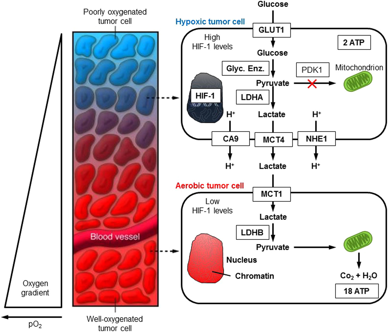 저산소 조건에서 HIF-1- 알파는 해당 대사를 조절하는 관련 유전자의 전사를 활성화하여 산화에서 해당 재 프로그래밍으로의 전환을 촉진합니다.--피루브산을 아세틸 CoA로 전환하는 PDH를 비활성화하는 GLUT 및 PDK1 및 피루브산을 젖산으로 산화시키는 젖산 탈수소효소 A(LDHA)