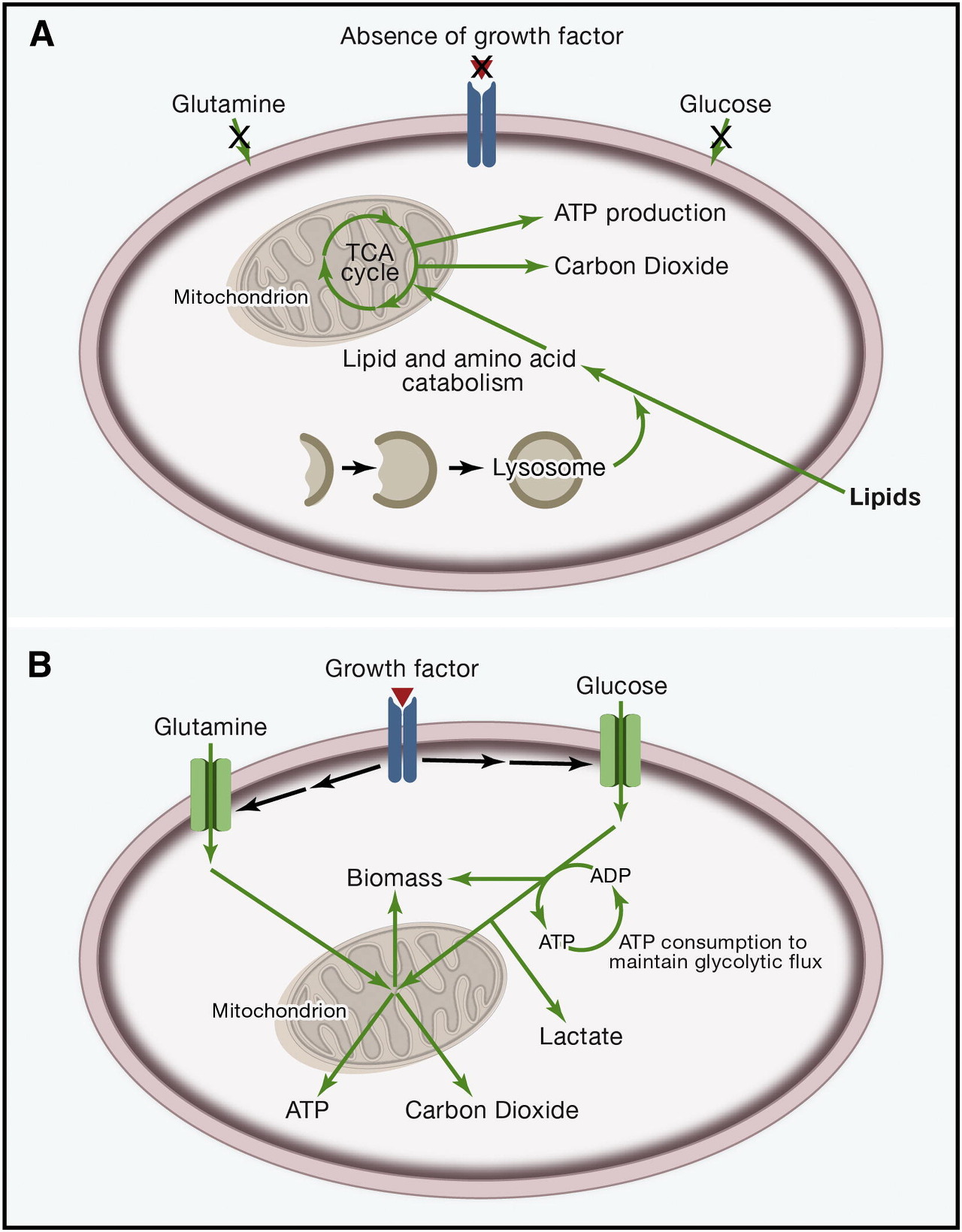 (A) 지시적 성장 인자 신호 가 없으면 다세포 유기체의 세포 는 자신을 유지하기 위해 충분한 영양분을 섭취하는 능력이 부족합니다. Neglected 된 세포는 충분한 산소를 사용할 수 있다고 가정하고 TCA주기를 통해자가 포식을 수행하고 아미노산과 지질을 분해합니다. 이 산화 적 대사는 ATP 생산을 극대화합니다.