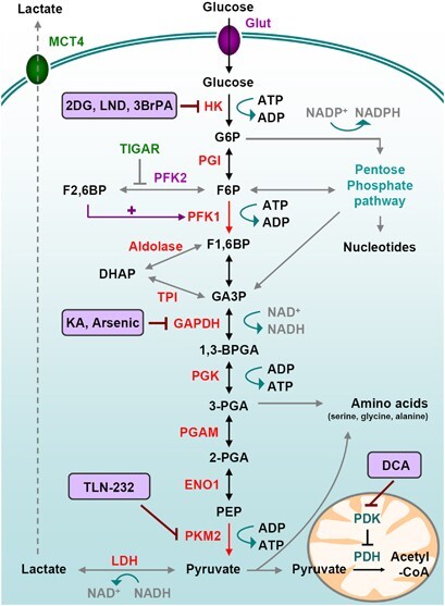 • 운반체: Glut: 포도당 운반체; MCT: 모노카르복실레이트 수송체. • 해당 중간체: G6P: 포도당-6-인산, F6P: 과당-6-인산; F1,6BP: 과당-1,6-이인산; F2,6BP: 과당-2,6-이인산; DHAP: 디히드록시아세톤 포스페이트; GA3P: 글리세르알데히드-3-포스페이트; 1,3-BPG: 1,3-비스포스포글리세레이트; 3-PGA: 3-포스포글리세레이트; 2-PG: 2-포스포글리세레이트; PEP: 포스포에놀피루베이트; • 효소: HK: 헥소키나제; PGI: 포스포글루코이소머라제; PFK: 포스포프룩토키나제; TPI: 트리오스 포스페이트 이소머라제; GAPDH: 글리세르알데히드 3-포스페이트 탈수소효소; PGK: 포스포글리세레이트 키나제; PGAM: 포스포글리세레이트 뮤타제; ENO1: 에놀라제 1; PK: 피루베이트 키나제; LDH: 젖산 탈수소효소. • 화학 억제제는 굵게 표시됩니다. 2DG: 2-데옥시-글루코스; LND: 로니다민; 3BrPA: 3-브로모피루베이트, KA: 코닝산; TLN-232는 PK를 표적으로 하는 합성 고리형 헵타펩티드입니다. DCA: 디클로로아세테이트