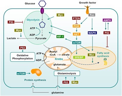 - Ras, PI3 K 또는 myc에 의해 촉진되는 것과 같은 발암성 경로는 해당과정을 촉진하는 반면, p53과 같은 종양 억제제는 이를 억제합니다.