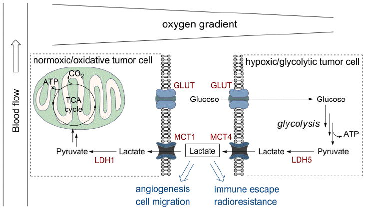 "당 분해성"및 "산화성"종양 세포 사이의 세포 간 셔틀의 공생 모델에서 젖산의 역할.