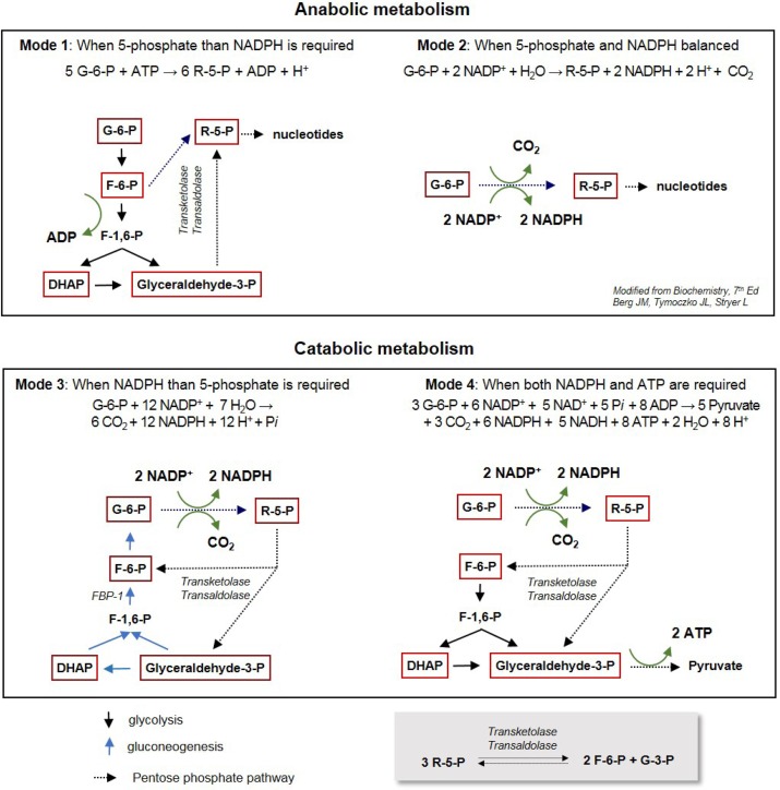 PPP와 해당 과정 사이의 다양한 대사 회로는 NADPH, R-5-P 및 ATP에 대한 기본적인 대사 요구에 따라 달라집니다