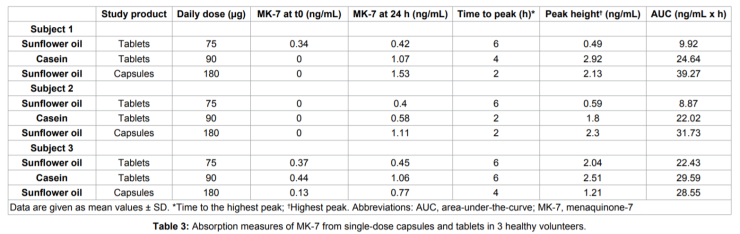 | https://www.mdpi.com/2072-6643/12/6/1852/htm MK-7은 흡수 및 생체 이용률 측면에서 가장 강력한 효능을 가진 것으로 보입니다. 섭취 4 시간 이내에 흡수되며 VK1보다 10 배 높은 식후 혈청 농도를 나타냅니다. MK-7은 반감기가 더 길고 (72 시간) 순환에서 최대 144 시간 동안 지속되는 반면 VK1은 혈장에서 빠르게 제거됩니다 . VK2 이소 폼 MK-4는 담즙에 의해 배설되고 VK1보다 빠르게 간에서 제거된다고 보고합니다. 그러나 VK1은 VK2 isoform MK-4로 변환 될 수 있습니다. 19 건의 무작위 대조 시험을 포함하는 대규모 메타 분석에서는 MK-4를 45 ~ 90mg / 일 또는 MK-7를 180 μg / 일 로 보충 한 골다공증이 있는 폐경기 여성의 척추 골밀도 (BMD)가 현저하게 개선 된 것으로 나타났습니다. ----------------------------------------------------------------------------------------------- https://www.ncbi.nlm.nih.gov/pmc/articles/PMC3502319/ 건강한 일본인 여성에게 MK-4 또는 MK-7의 단일 경구 투여 (420μg) 후 혈청 비타민 K2 수치를 비교했습니다. MK-7의 단일 섭취는 모든 피험자에서 혈청 MK-7을(그래프로 보면 대략 7ng/ml) 증가 시켰으며, 투여 후 6 시간에 최대 수준에 도달했습니다. MK-7은 투여 48 시간 후에 검출되었습니다. 반대로, 혈청 MK-4는 어느 시점에서도 검출되지 않았습니다. 7 일 동안 MK-4 및 MK-7 (60μg / 일)을 연속 투여 한 후 혈청 비타민 K2 수치를 비교했습니다. MK-4 섭취는 MK-4 투여군에서 증가하지 않았지만, 혈청 MK-7은 MK-7 투여군에서 유의하게 증가했습니다(그래프로 보면 대략 9ng/ml) 500μg MK-4 / 일을 2 개월 동안 보충하면 오스테오칼신의 카르복실화에 영향을 미치지 않는 반면, 오스테오칼신의 카르복 화를 개선하려면 1500μg MK-4 / 일의 용량이 필요했습니다. 이들과 우리의 데이터로부터 우리는 420-500 μg 이상의 MK-4 섭취가 필요하다는 결론을 내릴 수 있습니다. 연속적인 MK-4 보충은 혈장 MK-4 수준을 증가시키지 않았지만 MK-7 보충은 건강한 여성 피험자에서 혈장 MK-7 수준을 유의하게 증가 시켰습니다. 오스테오칼신의 카르복실화에 MK-7 (45–90 μg / day)의 용량에 효과적인 결과를 나타냈습니다. |