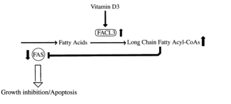 인간 전립선암 LNCaP 세포에서 제안된 비타민 D3의 FAS 발현 억제 메커니즘의 개략도. FACL3 발현은 비타민 D3에 의해 상향 조절되고, 증가된 FACL3 발현은 피드백 억제를 통해 FAS 발현을 조절하는 장쇄 지방 아실-CoA의 형성을 향상시켜 세포 성장과 세포자멸사를 조절하는 FAS 발현을 감소시킵니다