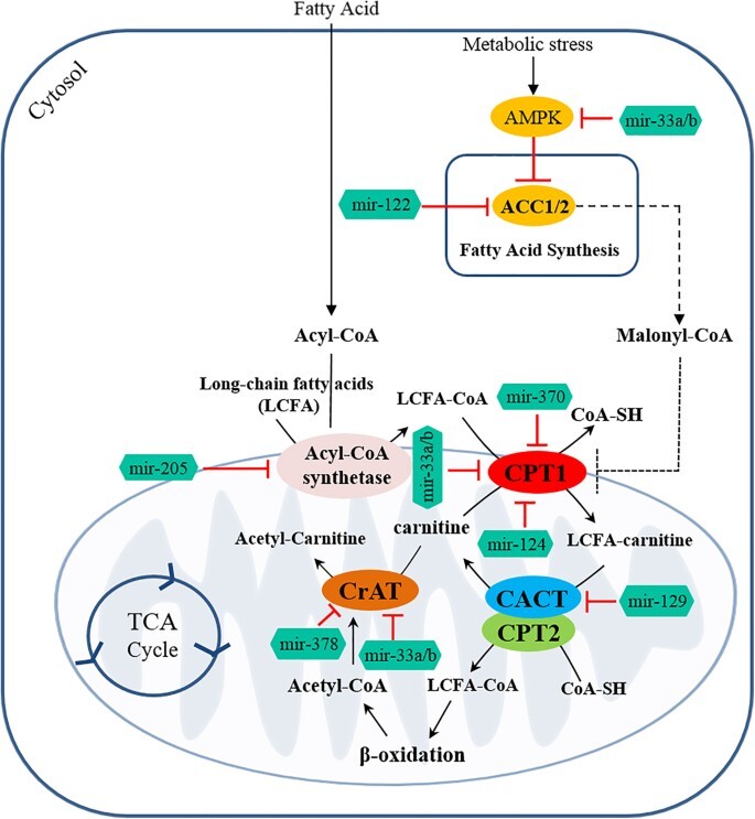 FAO 규제 완화에 대한 큰 기여는 CPT1A, CAC 및 CAT를 표적으로 하는 동일한 microRNA의 하향 조절 때문입니다.