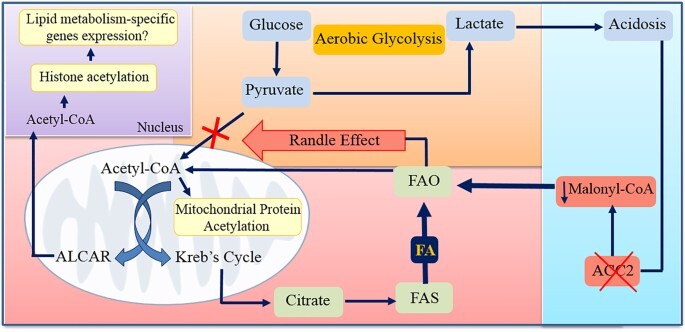 FAO 과정에서 생성되는 두 가지 대사 중간체인 니코틴아미드 아데닌 디뉴클레오티드(NADH)와 아세틸-CoA는 PDK의 활성화를 유도하고, 이는 PDH 복합체의 E1α 서브유닛을 인산 불활성화시켜 포도당 산화 속도를 낮추고 속도를 높입니다. 젖산 방출70 .