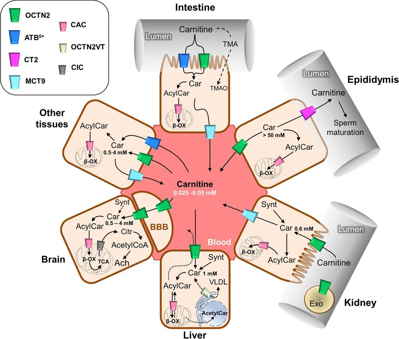 카르니틴의 장 흡수 및 신장 재흡수는 주로 카르니틴 처리 수송체 중에서 카르니틴에 대한 가장 높은 친화도를 나타내는 원형질막 유기 양이온 수송체 소설 2(OCTN2 – SLC22A5)에 의해 매개됩니다.