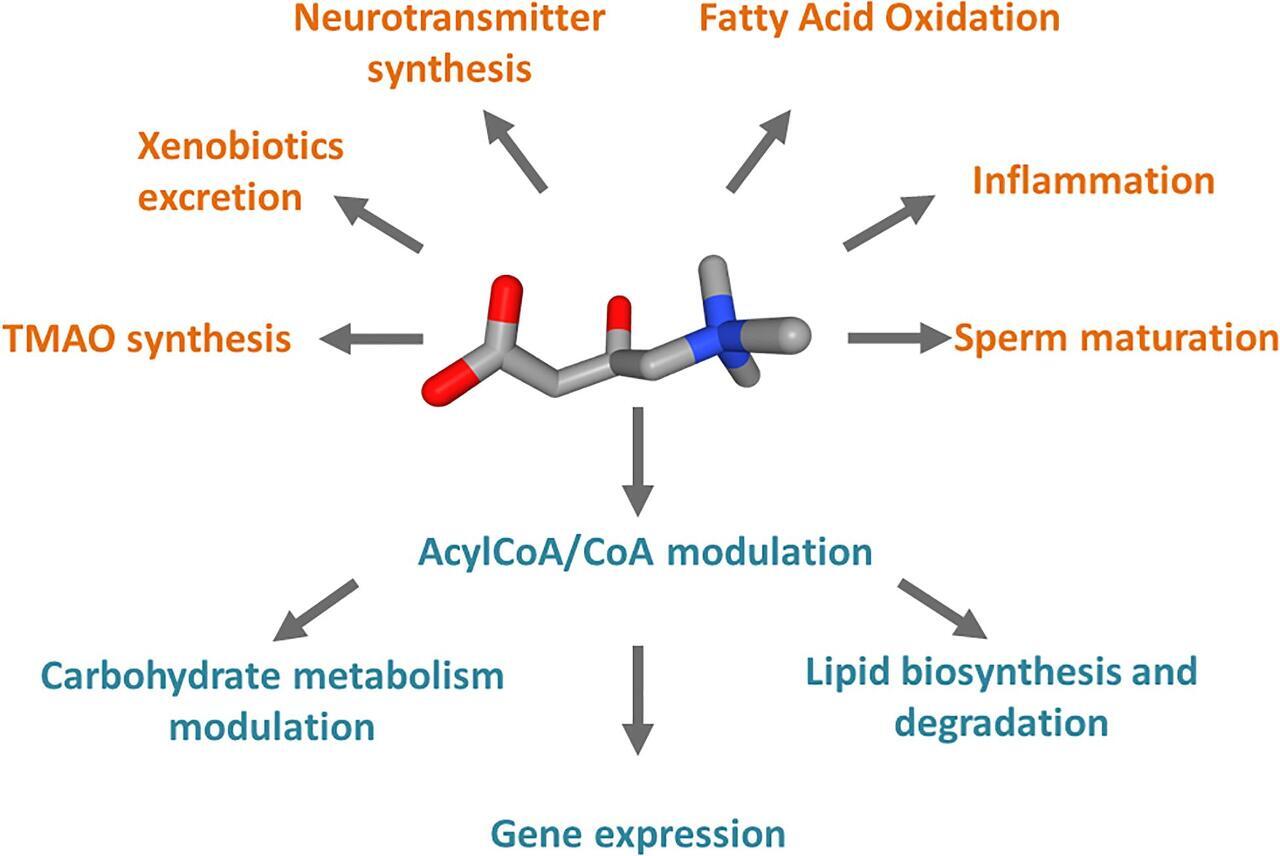 또한 카르니틴은 아실-CoA/CoA 균형 조절에 중요하며, 이는 탄수화물과 지질 대사를 조절합니다.