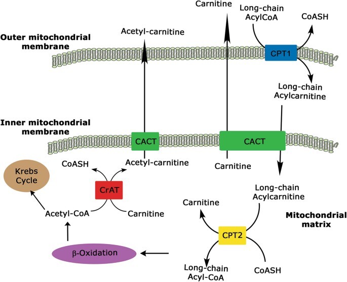 CS의 구성요소는 둘 다 아실-CoA + 카르니틴 ↔ CoA + 아실카르니틴 반응을 촉매할 수 있는 효소와 세포질에서 미토콘드리아로 또는 그 반대로 아실 부분의 양방향 수송에 관여하는 운반체입니다. 이 수송 시스템을 구성하는 4가지 구성요소: 카르니틴 팔미토일트랜스퍼라제 1(CPT1) 및 2(CPT2), 카르니틴-아실카르니틴 트랜스로카제(CACT), 카르니틴 회로를 닫는 카르니틴 아세틸트랜스퍼라제(CrAT), FAO 생산 아세틸-카르니틴으로서의 아세틸-CoA(도 1 ).