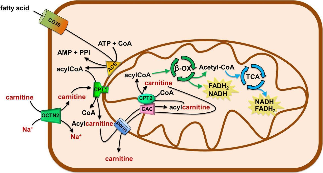 카르니틴 공급은 미토콘드리아에 의한 지방산의 베타 산화를 수행하기 위한 필수 조건입니다.