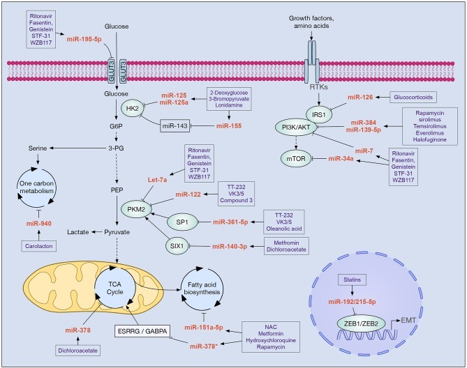 다양한 miRNA가 효소(예: HK2, PKM2, IRS1, PI3K, AKT, mTOR),