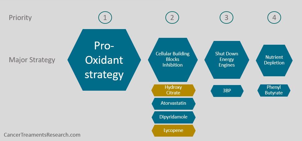 따라서 항산화제 감소 전략(보다 구체적으로 이 전략에서 용도 변경 약물)은 화학 요법에 대한 펄스에 적용됩니다. 이 전략을 지원하기 위해 보충제와 추가 정맥내 치료가 추가되며 보다 지속적인 방식으로 사용할 수 있습니다.