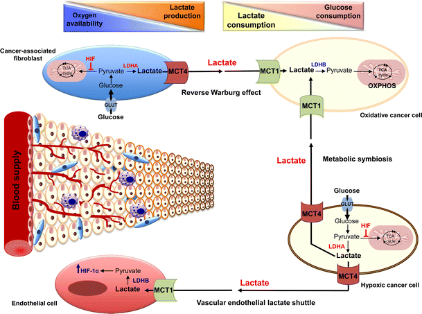 다른 젖산 셔틀에 추가하여 "역 Warburg 효과"라고 하는 이 종양-기질 협력은 종양 내에서 젖산 및 포도당 소비 구배의 설정을 초래합니다