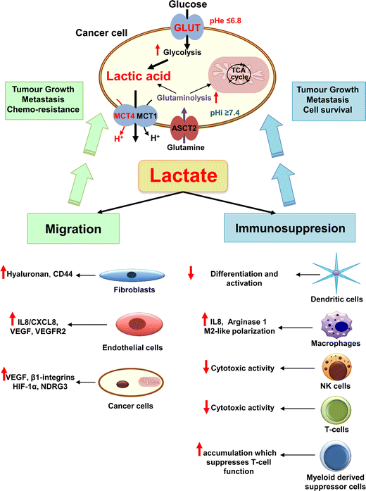 세포외 환경에서 젖산의 축적은 세포외 pH(pHe)의 저하, 종양 미세환경의 산성화를 유도하고 여러 암 과정을 촉진합니다