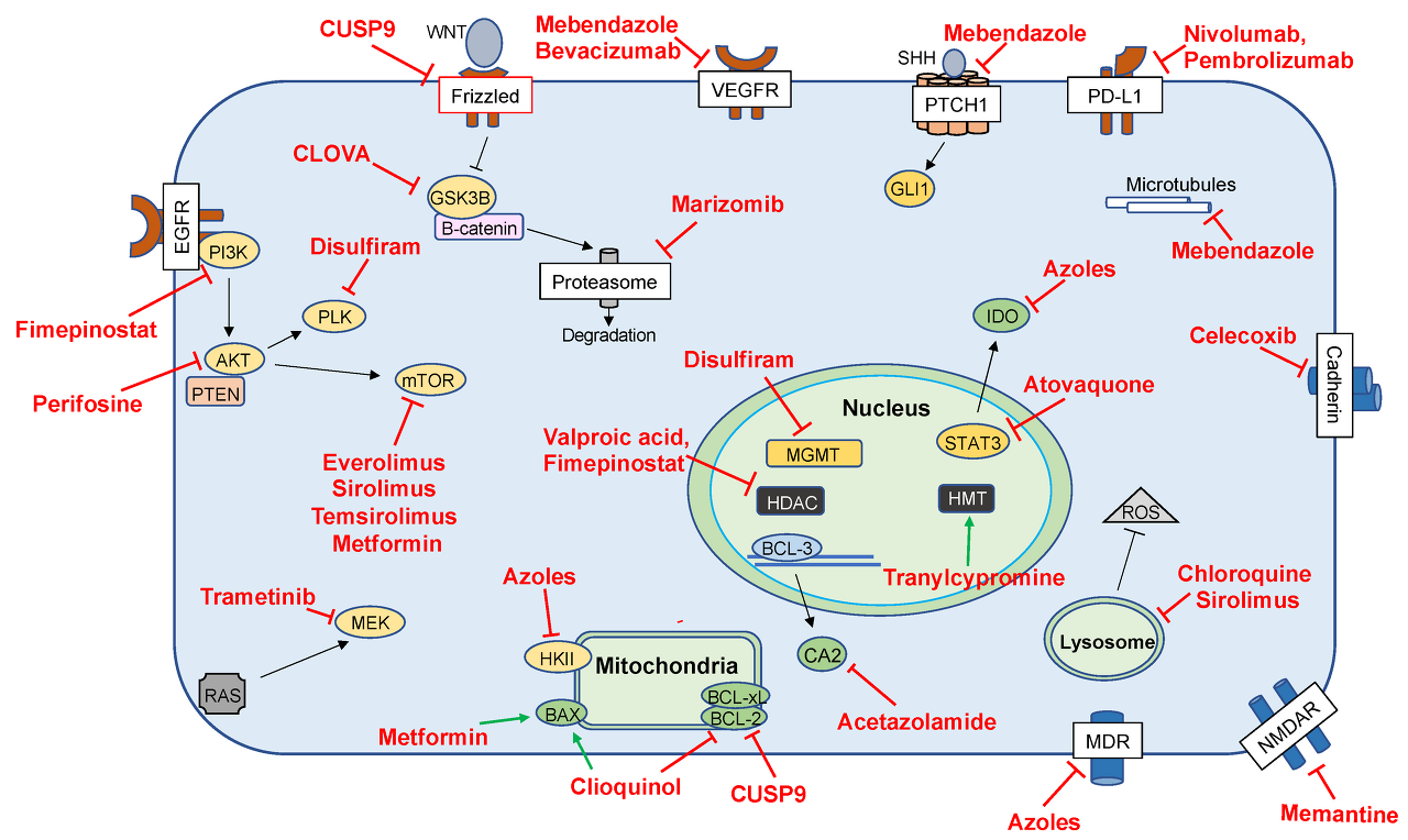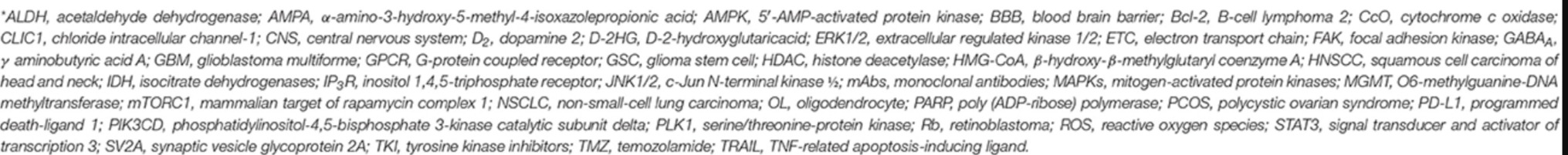 Abbreviations: Histone deacetylase (HDAC); O6-methylguanine-DNA methyltransferase (MGMT); histone methyltransferase (HMT); carbonic anhydrase 2 (CA2); muli-drug resistance protein (MDR); N-methyl-D-aspartate receptor (NMDAR); Indoleamine 2,3-dioxygenase (IDO); glioma-associated oncogene (GLI1); protein patched homolog 1 (PTCH1); programmed death-ligand 1 (PD-L1); polo-like kinase 1 (PLK); mitogen-activated protein kinase kinase (MEK); mechanistic target of rapamycin (mTOR); hexokinase II (HKII); glycogen synthase kinase (GSK3B); phosphoinositide 3-kinase (PI3K); signal transducer and activator of transcription 3 (STAT3); phosphatase and tensin homolog (PTEN); protein kinase B (AKT); reactive oxygen species (ROS); rat sarcoma (RAS); extracellular signal-regulated kinase (ERK); vascular endothelial growth factor receptor (VEGFR); endothelial growth factor receptor (EGFR); Bcl-2-associated X protein (BAX); B-cell lymphoma 2 (BCL2); B-cell lymphoma-xL (BCL-XL): B-cell lymphoma 3-encoded protein (BCL-3).