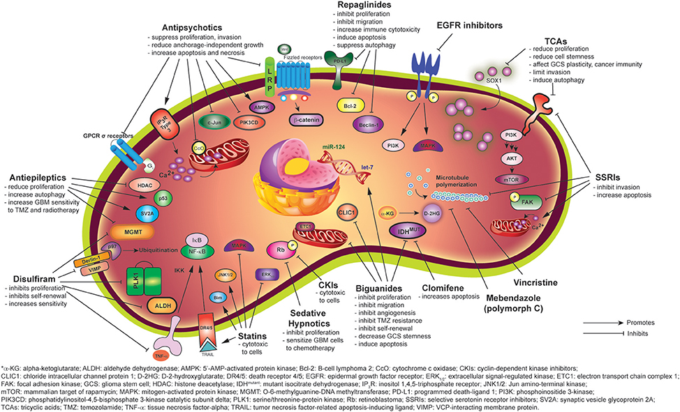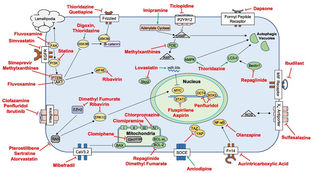 Abbreviations: Adenosine diphosphate receptor (P2YR12); cyclic adenosine 3′,5′-cyclic monophosphate (cAMP); adenosine 3′,5′-cyclic monophosphate (AMP); phosphodiesterase (PDE); glycogen synthase kinase (GSK3B); phosphoinositide 3-kinase (PI3K); AMP-activated protein kinase (AMPK); microtubule-associated protein 1A/1B-light chain 3 phosphatidylethanolamine conjugate (LC3-II); signal transducer and activator of transcription 3 (STAT3); (sex determining region Y)-box 2 (SOX2); octamer-binding transcription factor 4 (OCT4); focal adhesion kinase (FAK); phosphatase and tensin homolog (PTEN); protein kinase B (AKT); eukaryotic translation initiation factor (eIF4e); S-phase kinase-associated protein 2 (Skp2); microRNA-33b (miRNA-33b); Macrophage migration inhibitory factor (MIF); reactive oxygen species (ROS); tafazzin (TAZ); yes associated protein (YAP); fibroblast growth factor-inducible 14 (Fn14); store-operated calcium entry (SOCE); isocitrate dehydrogenase 1 (IDH1); enhancer of zeste homolog 2 (EZH2); rat sarcoma (RAS); extracellular signal-regulated kinase (ERK); epidermal growth factor receptor (EGFR); t-type calcium channel (CaV3.2); Bcl-2-associated X protein (BAX); B-cell lymphoma 2 (BCL2); B-cell lymphoma-xL (BCL-XL); nuclear factor kappa-light-chain-enhancer of activated B cells (NF-KB).