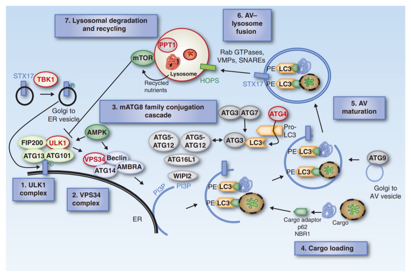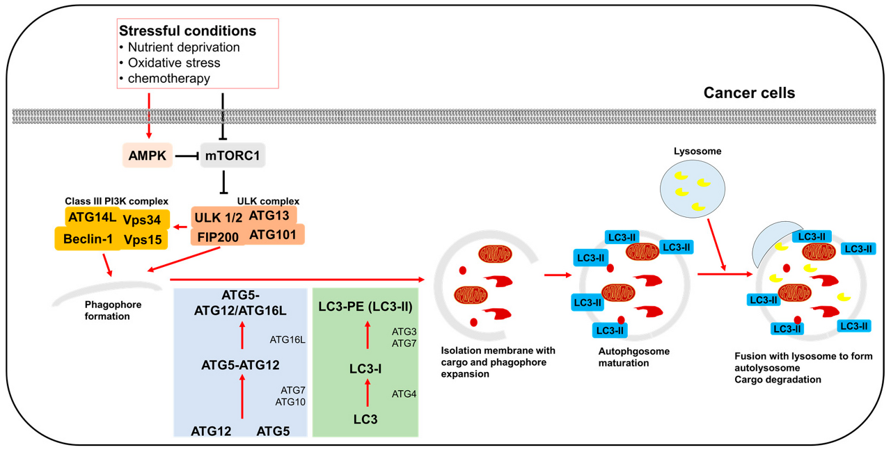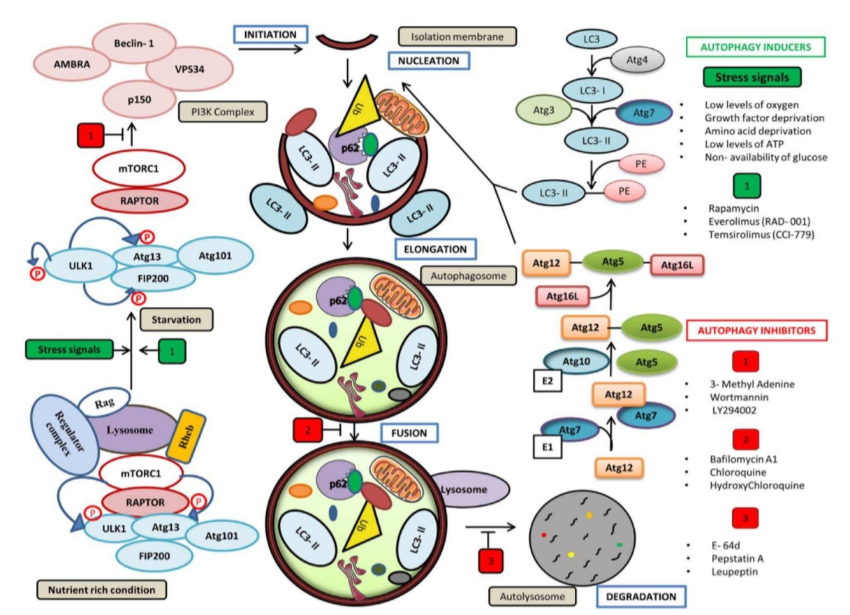 이 autophagosomes는 스트레스가 많은 조건에서 재활용되도록 분해된 세포질 구성 요소를 리소좀으로 전달합니다. 이러한 자가포식 메커니즘은 손상된 단백질로부터 세포를 보호하고 독소로부터 세포 소기관을 보호하며 세포 대사 및 에너지 항상성을 유지하고 세포 생존을 촉진하는 데 필수적입니다( 그림 1 ).