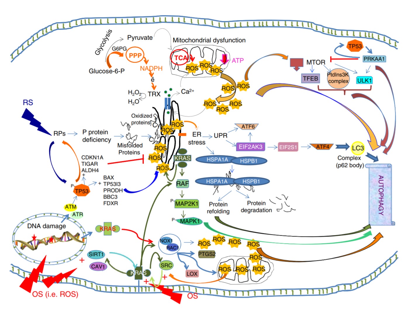 KRAS에 의해 유도된 종양은 NOX1/RAC1 복합체를 통해 ROS를 활성화할 수 있으며, 이는 ROS 생성에 관여하는 수많은 유전자를 활성화하여 자가포식을 자극합니다.