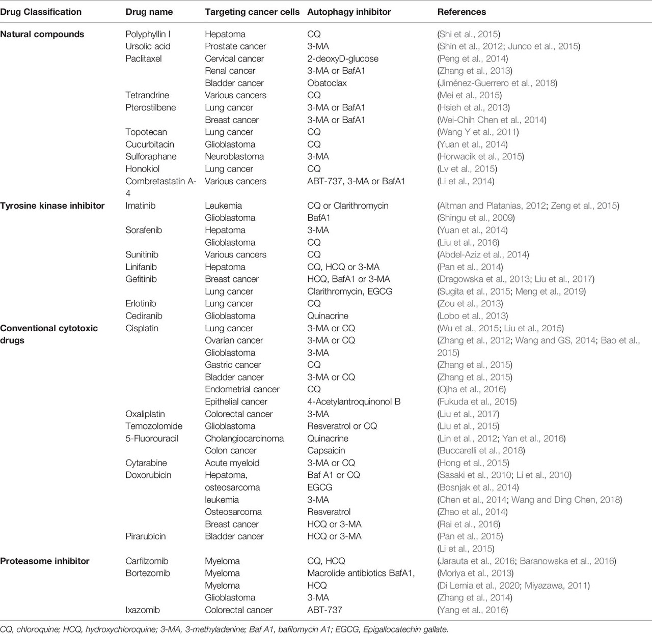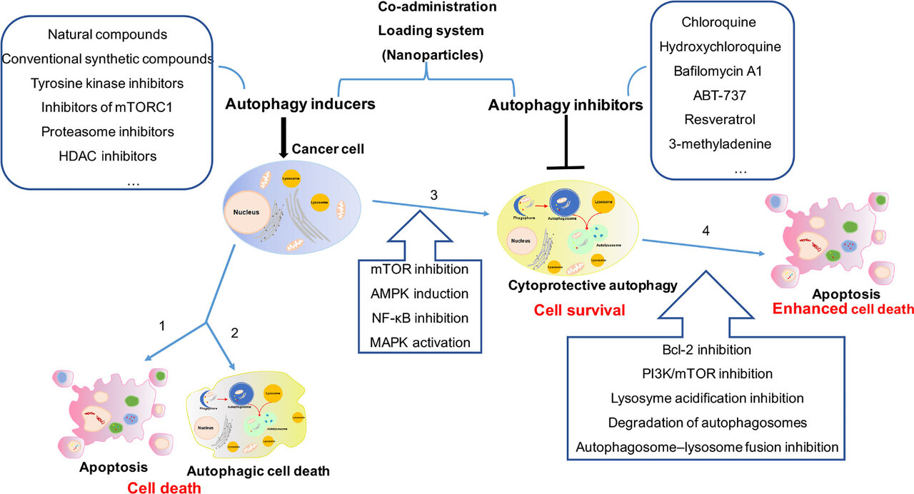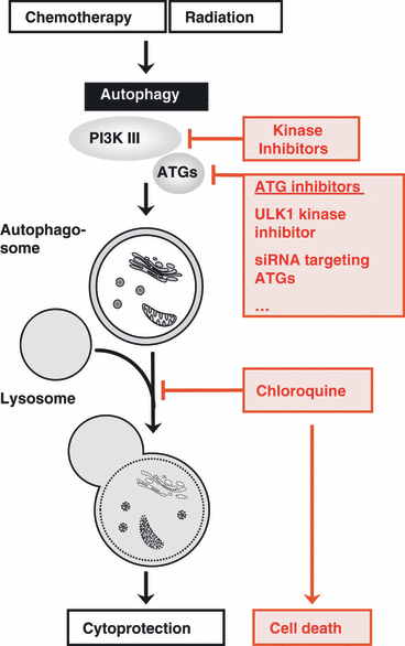 현재 자가포식 억제(3-메틸아데닌 처리, 자가포식 유전자의 유전적 녹다운 또는 클로로퀸(또는 하이드록시클로로퀸) 처리)가 다양한 세포독성 물질에 의해 유도된 세포 사멸에 대해 종양 세포를 민감하게 한다는 여러 연구가 있습니다.