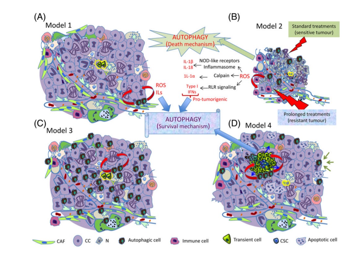 이 시간 동안 괴사 세포가 축적되어 종양 미세 환경의 ROS 수준이 증가하고 전 종양 형성 사이토 카인을 생성하는 신호 전달 캐스케이드가 발생할 수 있습니다. 그러면 Autophagy는 생존 메커니즘이 될 것입니다.
