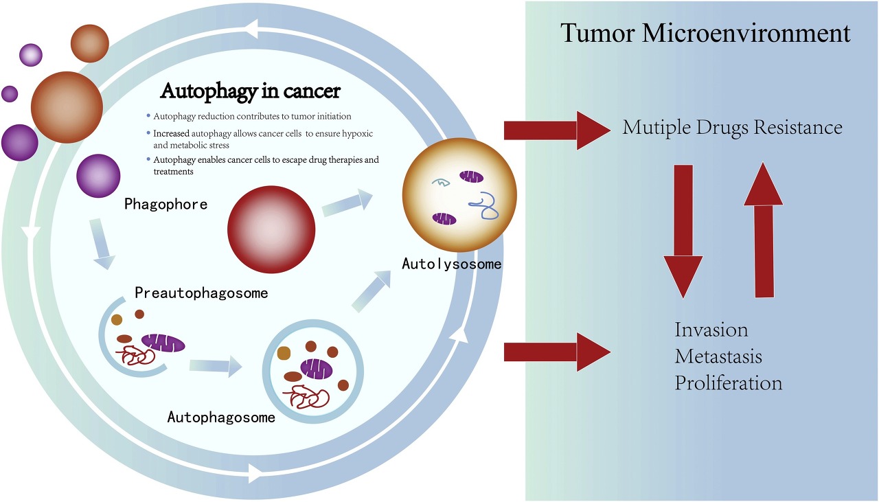 여러 연구에 따르면 autophagy는 진행된 암에서 종양의 생존과 성장을 촉진하는 작용을 합니다.