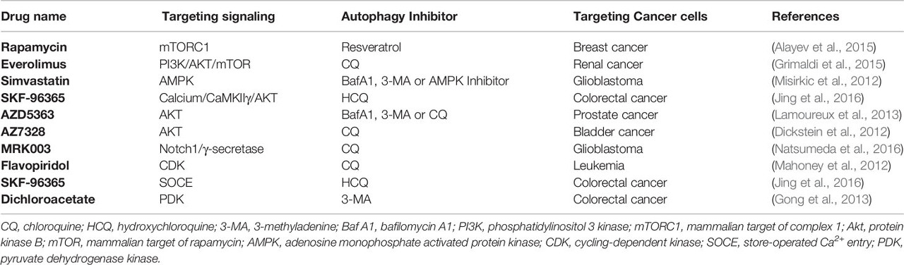 많은 화학요법제가 자가포식을 유도하지만(적어도 간접적으로 세포 스트레스를 유도함으로써), 대부분의 노력은 기저 자가포식 수준이 높은 종양 세포주(예: 발암성 RAS 돌연변이가 있는 것)에서 자가포식 억제제를 사용하거나 자가포식 억제제를 함께 사용하는 데 초점을 맞추었습니다.