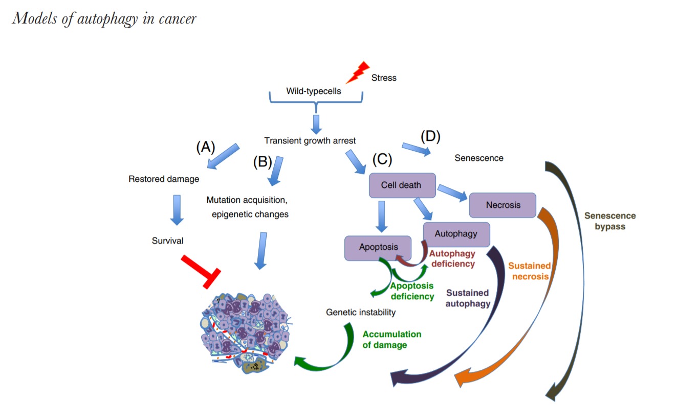 결과적으로 autophagy는 죽음과 관련된 반응에서 생존을 선호하는 pro-tumorigenic 메커니즘으로 바뀔 수 있습니다..