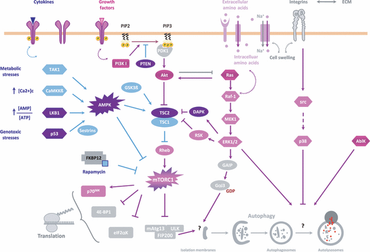 이러한 신호 전달 캐스케이드의 미확인 자가포식 표적은 물음표로 표시됩니다.