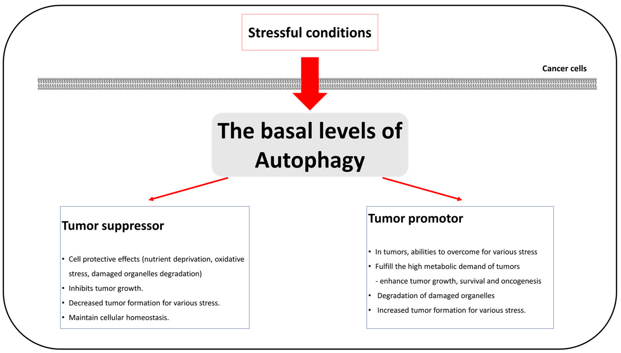 autophagy의 기본 수준은 손상된 세포 부분과 단백질의 감소와 세포 항상성의 유지를 통한 종양 억제 메커니즘으로 작동합니다[ 51 ].
