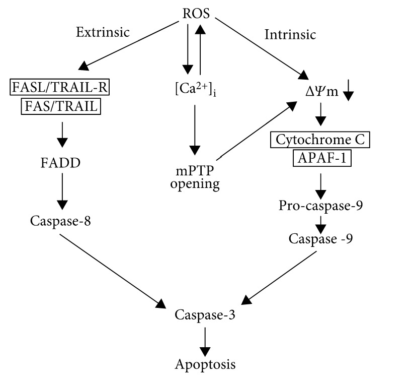 ROS 매개 세포자멸사는 미토콘드리아 내재적 세포자멸사, 신호전달 또는 사멸 수용체 경로를 통한 외인성 세포자살성 신호전달에 의해 시작될 수 있습니다(그림 4 ).