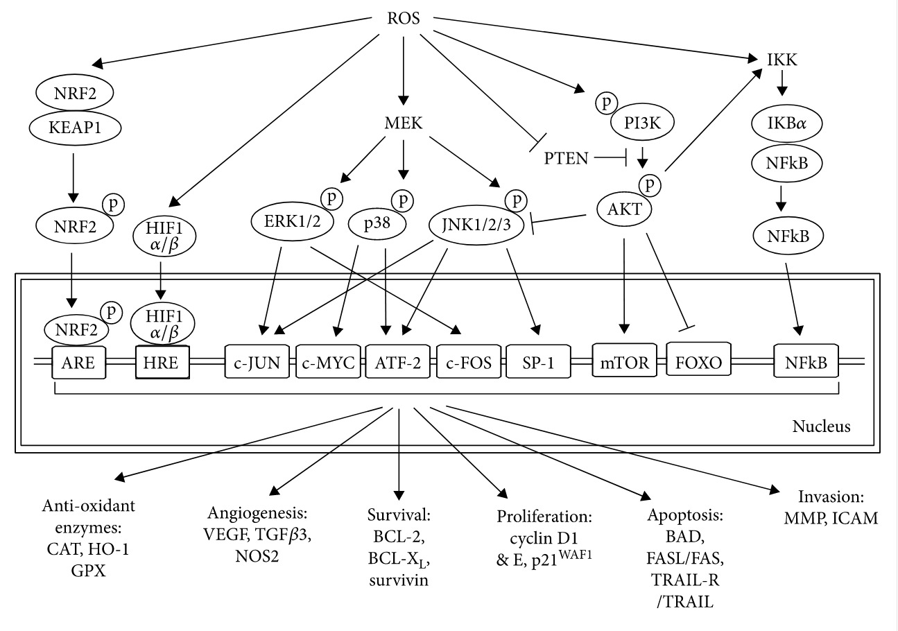 ROS 역치 미만의 수준에서 ROS는 Ras 및 c-Myc와 같은 종양 유전자를 활성화 하고 암세포에서 p53 매개 DNA 복구 및 생존을 유도합니다.