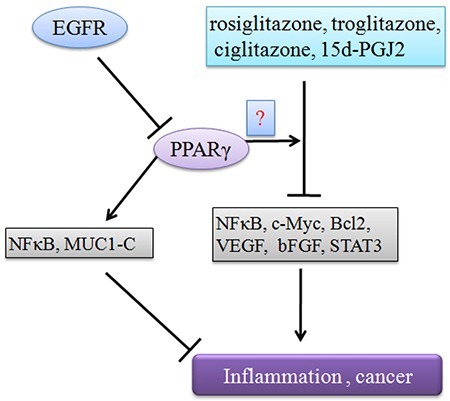 작용제는 NFκB, c-Myc, Bcl2, VEGF, bFGF, STAT3의 억제에 관여하는 PPARγ 의존적 또는 독립적인 방식으로 종양 진행을 조절합니다. 또한, EGFR은 PPARγ 항종양 기능을 종결시킬 수 있습니다.