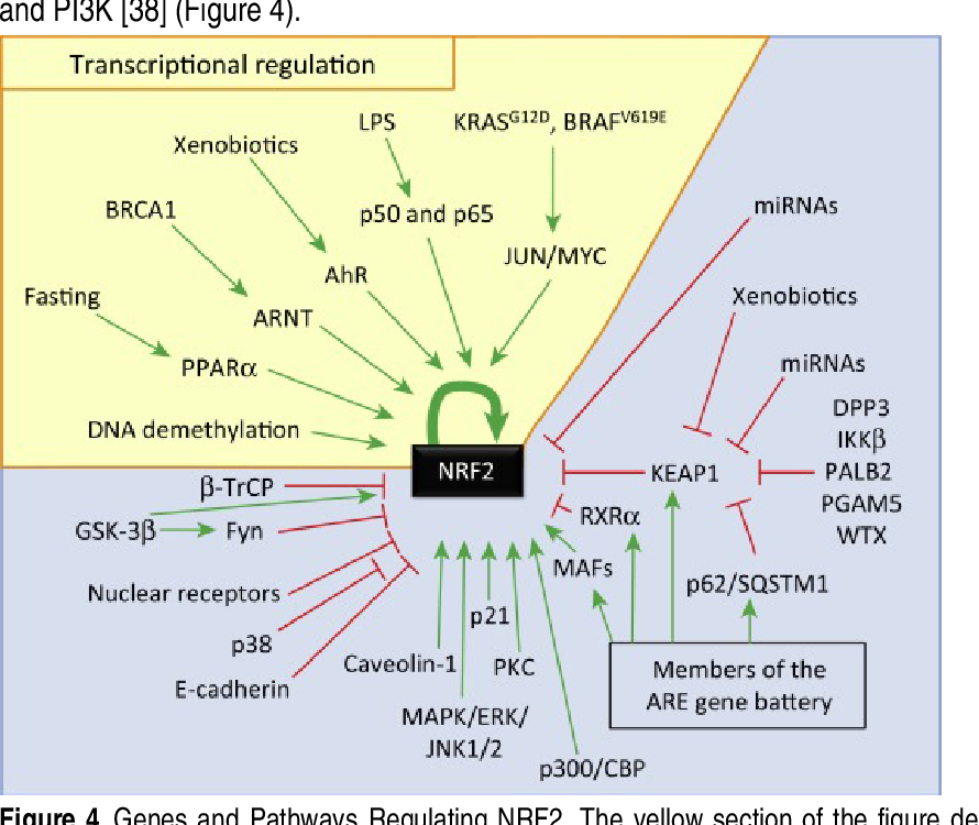 그림의 노란색 부분은 전사 수준에서 NRF2 발현을 조절하는 마우스와 인간에서 확인된 유전자를 나타냅니다.