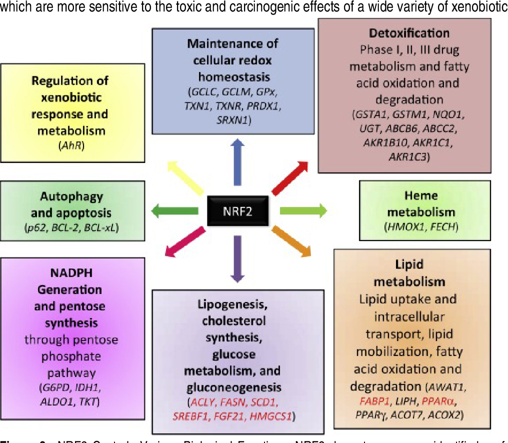 NRF2는 글루코스-6-인산 탈수소효소(G6PD), 포스포글루코네이트 탈수소효소(PGD), 트랜스케톨라제(TKT), 트랜스알돌라제 1(TALDO1), 말산 효소 1(ME1) 및 이소시트레이트 탈수소효소 1(IDH1)과 같은 대사 유전자의 상향 조절을 매개합니다.