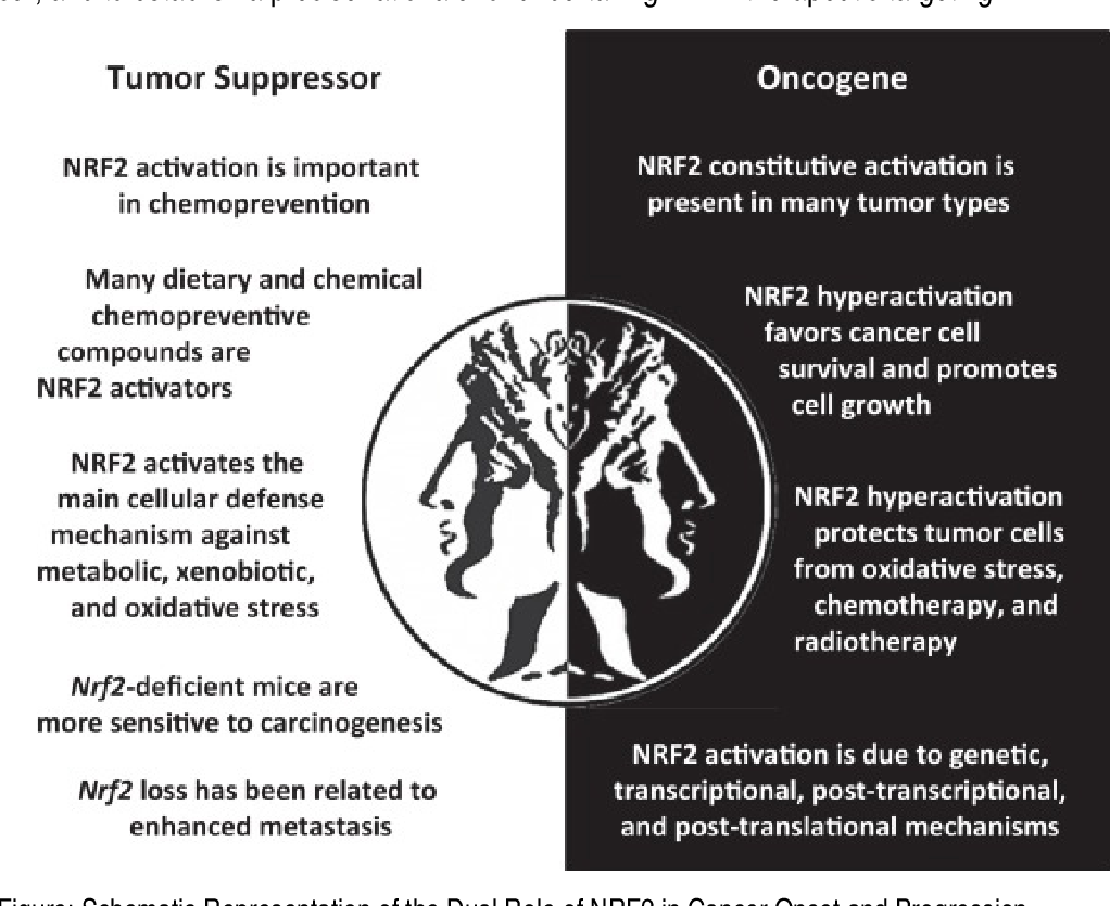 암 발병 및 진행에서 NRF2의 이중 역할에 대한 도식적 표현