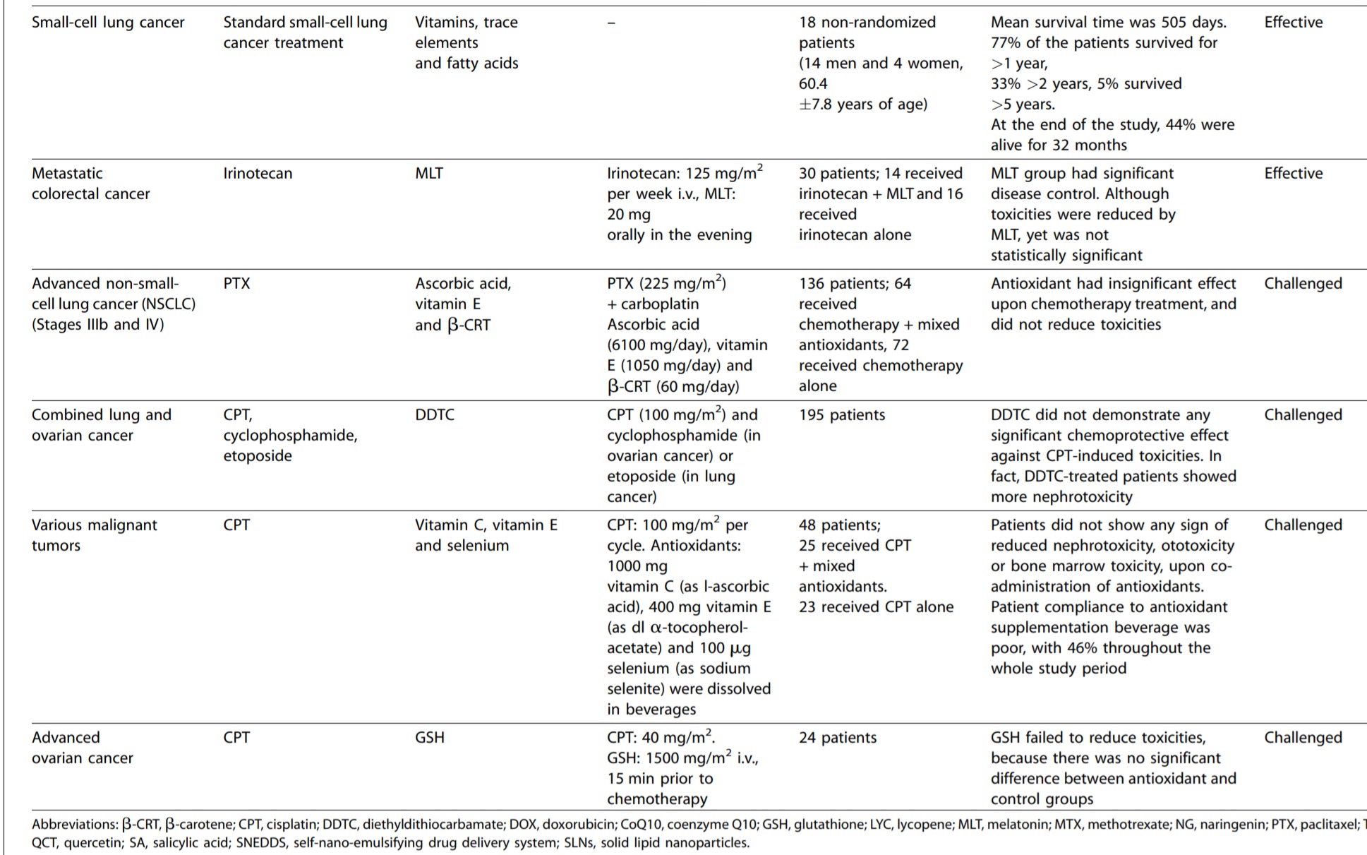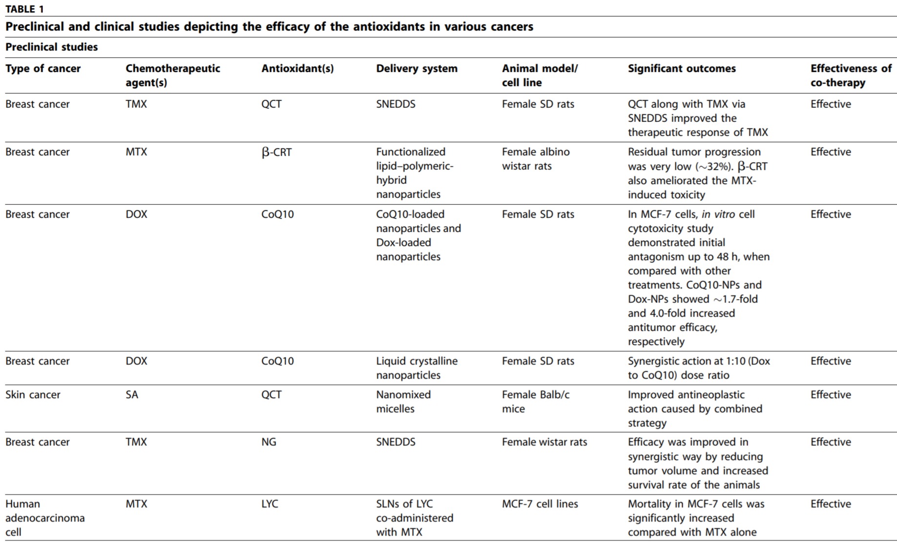 표 1은 암 치료에 동시에 사용되는 동시에 항산화제와 화학요법제 및/또는 방사선과의 효과적인 관계 또는 그렇지 않은 관계의 개요를 나타내는 전임상 및 임상 연구에 대한 조감도 설명을 제공합니다.