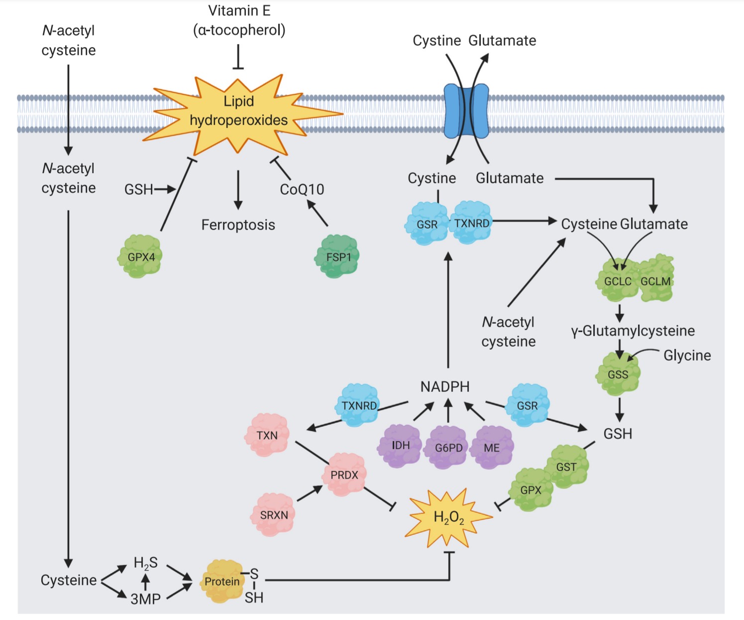 GSH 환원효소(GSR) 및 TXN 환원효소(TXNRD1)는 NADPH를 사용하여 GSH 및 TXN을 재생하고 수입된 시스틴을 시스테인으로 환원합니다.