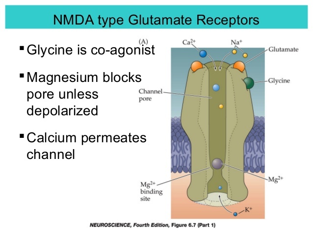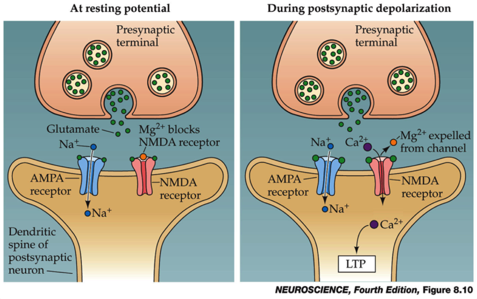 우선 글루탐산이 수용체에 결합하면 수용체 통로가 열리는데, 막전위가 탈분극되기 전에는 재빨리 Mg2+가 이 통로를 막아(수 밀리초) 실제 이동하는 Ca2+는 얼마 되지 않는다. 추가적인 Ca2+이 계속 유입되기 위해서는 막전위의 탈분극이 일어나야한다.