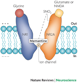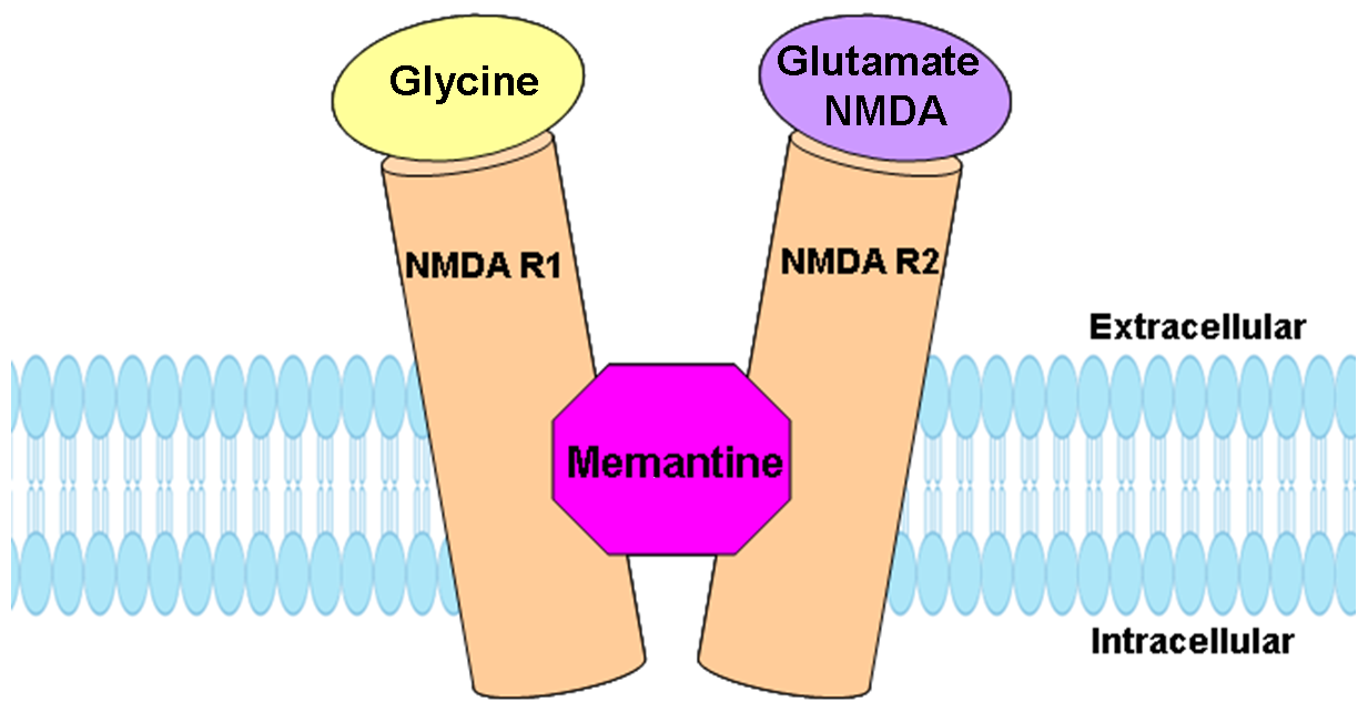 메만틴은 NMDA 수용체의 통로를 막아 Ca2+의 유입을 차단하는 비경쟁적 길항제로 NMDA수용체에 대한 적절한 분리율(off-rate)과 친화도를 가지고 있어 높은 글루탐산 농도로부터 신경세포를 보호할 수 있다.