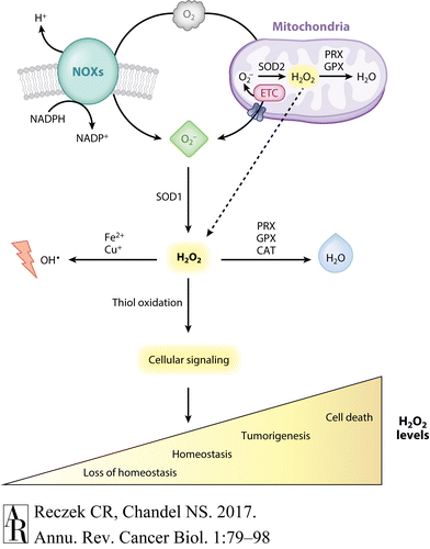 생산 부위 근처의 H 2 O 2 는 국소적으로 작용할 수 있고 주변의 표적 단백질을 산화시켜 protumorigenic 신호 전달을 촉진할 수 있습니다.