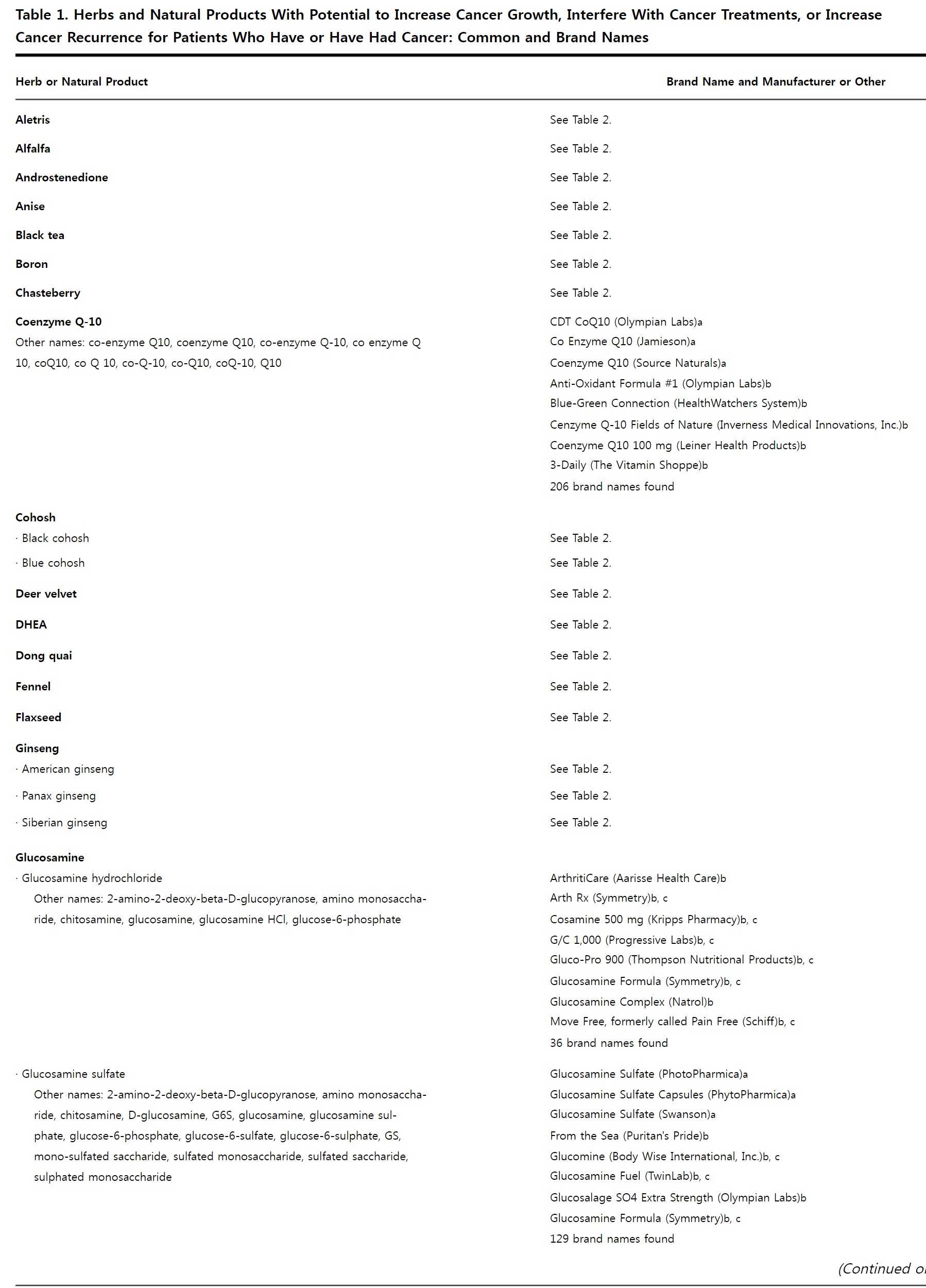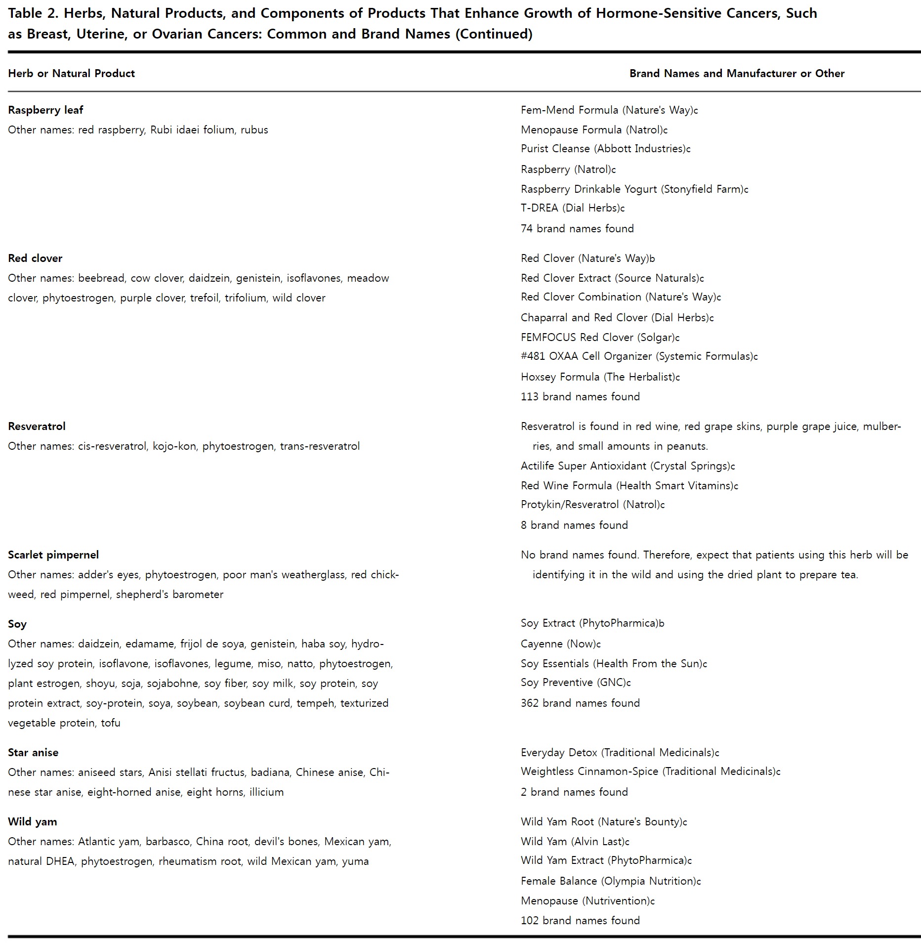 암 성장 또는 재발을 증가시키는 허브 또는 천연 제품