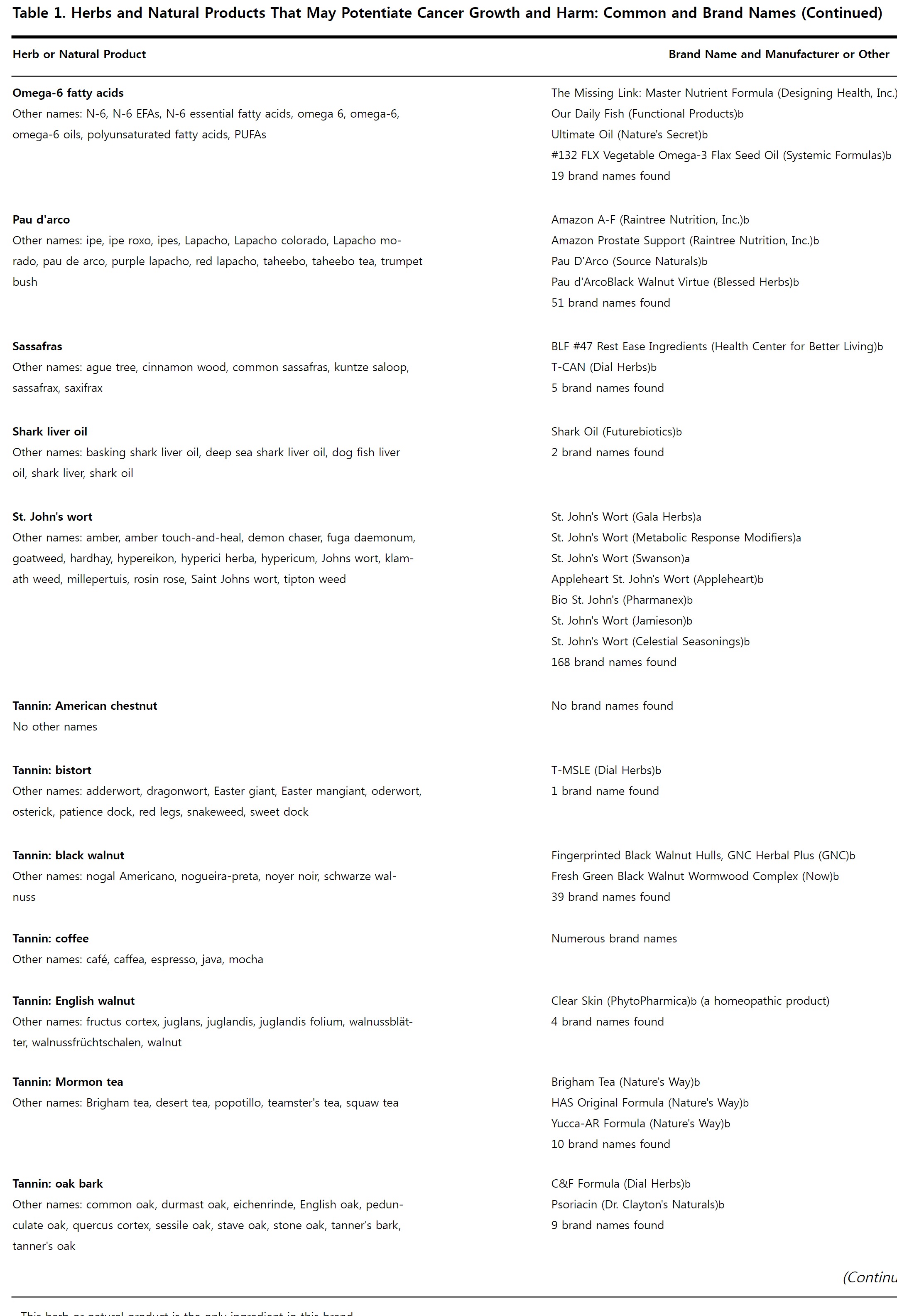 세인트 존스 워트(St. John's wort)는 암을 직접적으로 유발하기 때문이 아니라(상호작용을 통해 암 성장을 촉진할 수 있음) 암 관련성, 대중적 인기, 해를 끼칠 가능성 때문에 이 경고 검토에 포함되었습니다.