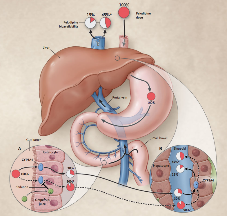 장 상피의 장세포에 존재하는 CYP3A 효소(예: CYP3A4)는 흡수되는 동안 펠로디핀을 광범위하게 대사하고 평균적으로 투여된 용량의 30%만이 문맥에 들어갑니다(실선).