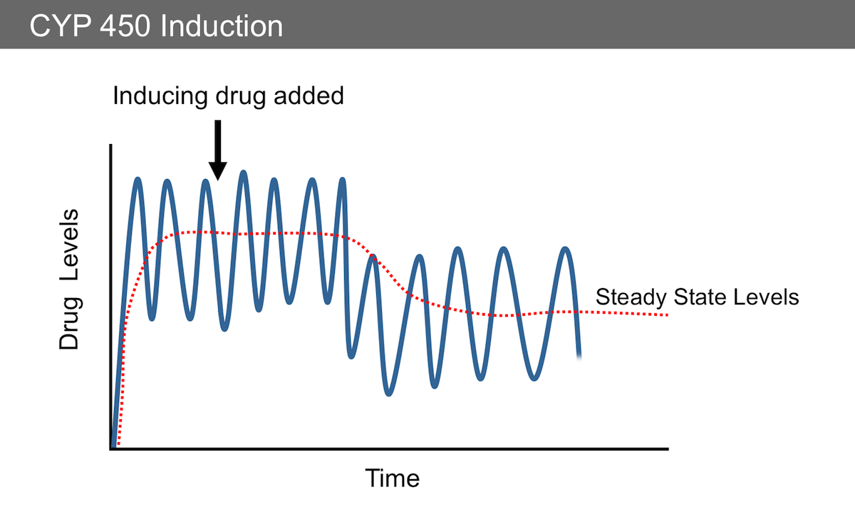 효소를 유도하는 약물(유도제)은 동일한 효소에 의해 대사되는 약물의 클리어런스를 증가시켜 다른 약물의 농도를 감소시킵니다( 그림 3 ).
