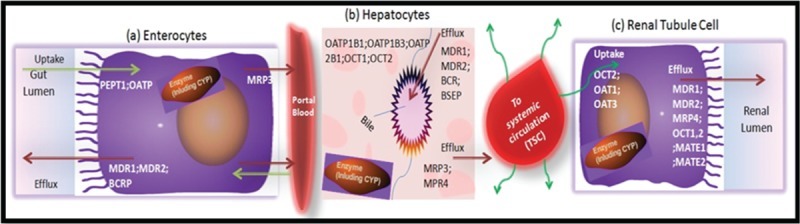 in the gut wall (A), liver (B), and kidneys (C) that may be involved in a drug's absorption, distribution, metabolism, and excretion.