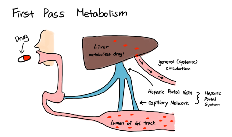즉, 흡수가 되지만 간에서 대사를 받은 후 전신 순환계로 가므로 흡수율이 떨어지는 경향이 있다.