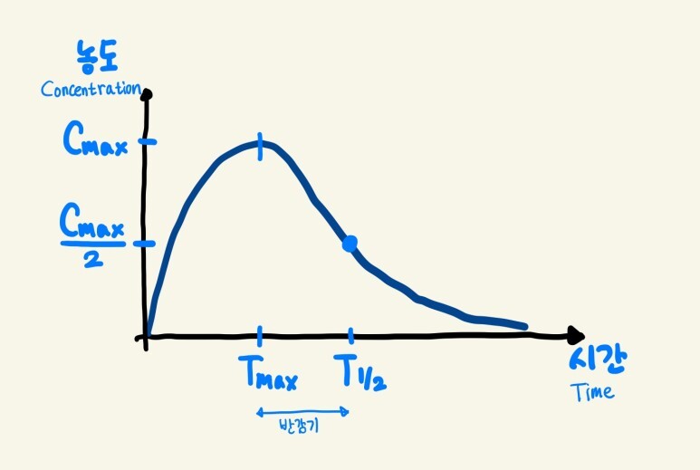 이때 Tmax와 T1/2 사이의 간격을 반감기 (Half life)라고 한다.