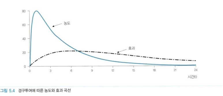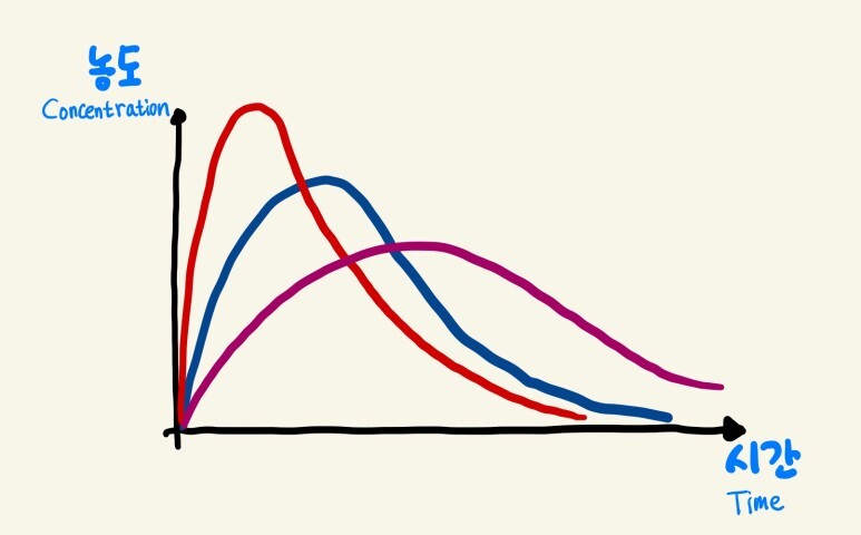 따라서 투여 후 대략적인 시간-농도 그래프는 다음과 같다.
