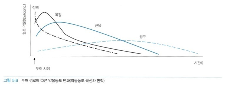 투여량이 같을 때, 투여 방식에 따라 시간-농도 그래프에 차이가 있다.