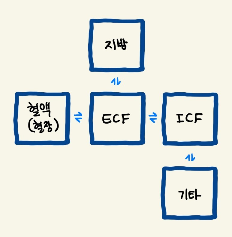 혈액(혈장), 지방, ECF, ICF, 기타 (CSF, 복막, 관절 낭액, 자궁 등)